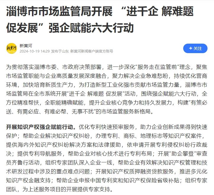 博山區(qū)市場監(jiān)管局領(lǐng)導(dǎo)和職能科室負(fù)責(zé)人一行此次深入企業(yè)走訪調(diào)研,重點(diǎn)針對(duì)企業(yè)生產(chǎn)經(jīng)營過程中遇到的知識(shí)產(chǎn)權(quán)、品牌賦能、行車叉車特殊工種、計(jì)量器具檢定、標(biāo)準(zhǔn)化創(chuàng)新等共60大類業(yè)務(wù)提供業(yè)務(wù)咨詢和指導(dǎo)服務(wù)。